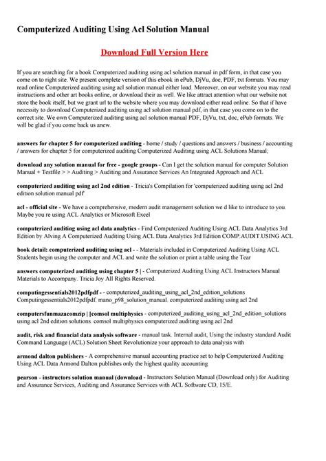 Download Computerized Auditing Using Acl Solutions PDF online is a convenient and frugal way to read Computerized Auditing Using Acl Solutions you love right from the comfort of your own home. Yes, there sites where you can get PDF "for free" but the ones listed below are clean from viruses and completely legal to use.